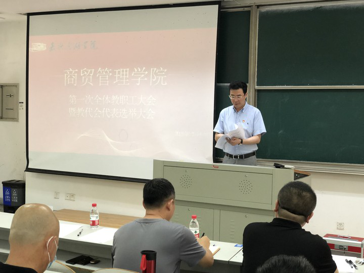 2021年7月5日下午,beat365官网在教一159召开第一次教职工大会。大会主要围绕beat365官网干部人事安排、嘉兴南湖学院第一届教代会代表推选等议题展开。校党委副书记郭坚刚同志在组织部方海涛副部长的陪同下出席大会,大会由副院长孔冬教授主持。