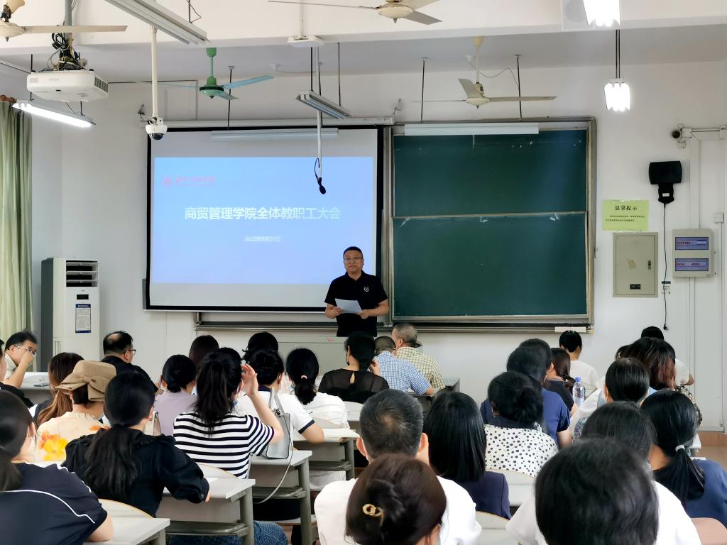 会上,刘勇对新入职教师进行了欢迎和介绍,并对今年就业工作与班主任工作进行了初步总结。随后,学院院长孔冬对近期暑期工作进度、就业率提升和优秀班主任三方面工作给予了充分的肯定,他表示,2022年上半年,beat365官网围绕“三个大学”发展目标,按照学校建设一流应用型大学建设要求,在重点现代产业学院和跨境电子商务项目申报上取得了新突破,希望全体教职员工再接再厉,跟紧学校和学院发展方向和步伐,获得更大进步。此外,孔冬院长对近期开学缓补考、课表调整、上课准备等注意事项进行了提醒。最后,刘勇副书记对开学之初防疫具体工作和要求进行了传达和强调。