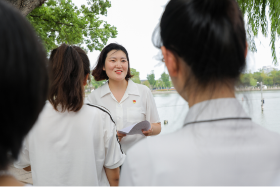 南湖碧波,激荡理想的起点;一叶红船,激荡百年风云变幻。全体新生在辅导员、班主任的带领下,一起来到了南湖湖心岛瞻仰红船。在南湖红船边,学生第一党支部书记、辅导员李艳燕老师向同学们生动地讲述红船故事,讲解“红船精神”的内涵。南湖的湖面碧波荡漾,波光粼粼,红船熠熠生辉,老师带领同学们感悟从小小红船到巍巍巨轮,体会中国共产党的百年奋斗征程。