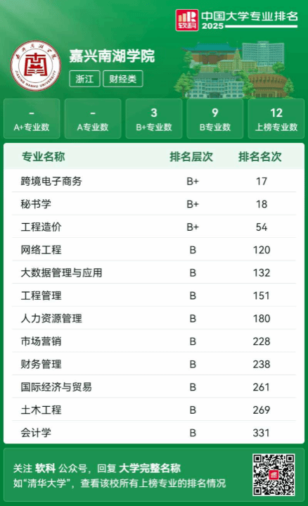 我院5个专业进入“2025软科中国大学专业排名”榜单,其中跨境电子商务专业全国排名17位,评级B+级,人力资源管理、市场营销、财务管理和会计学专业评级B级。我院入榜专业数占全校入榜专业数的42%,专业建设表现突出。