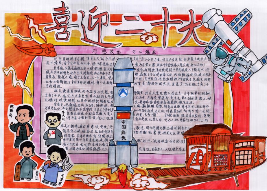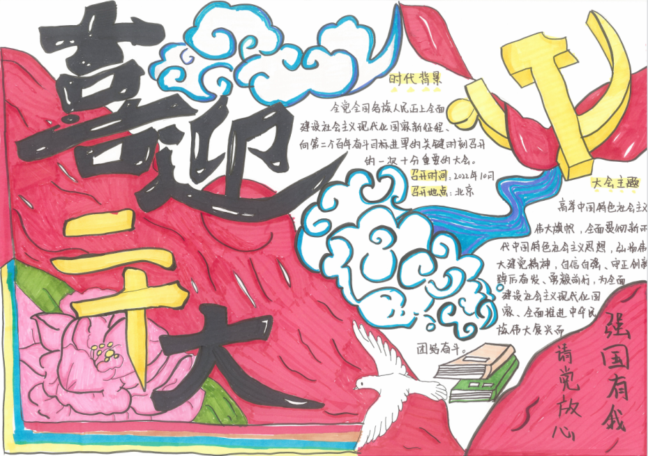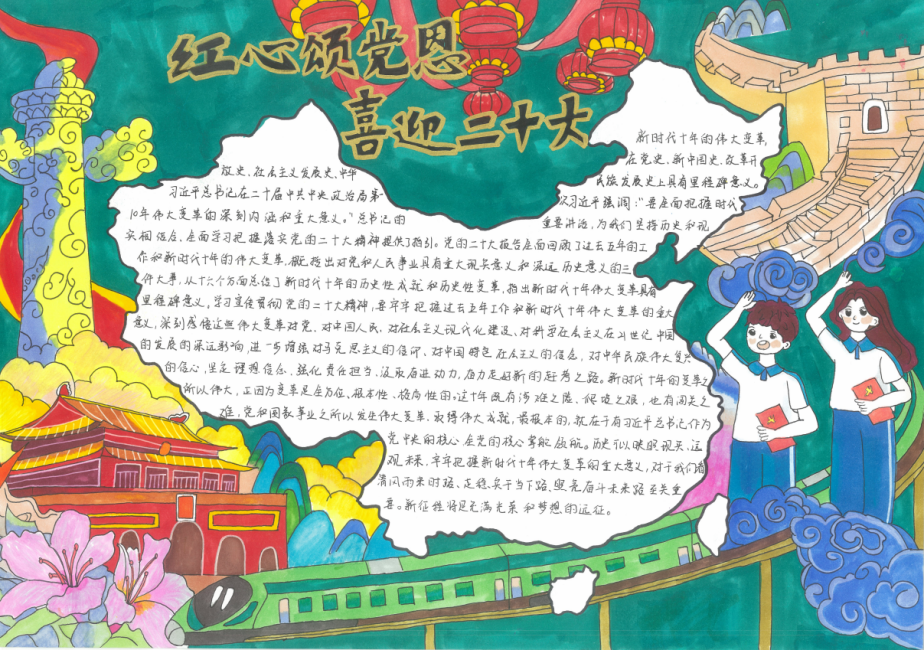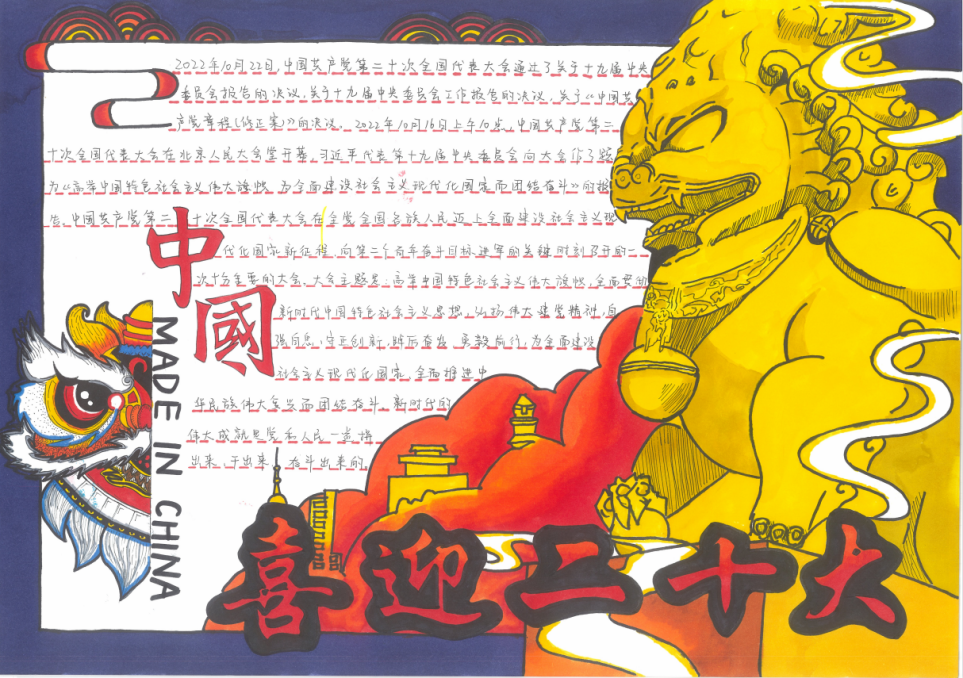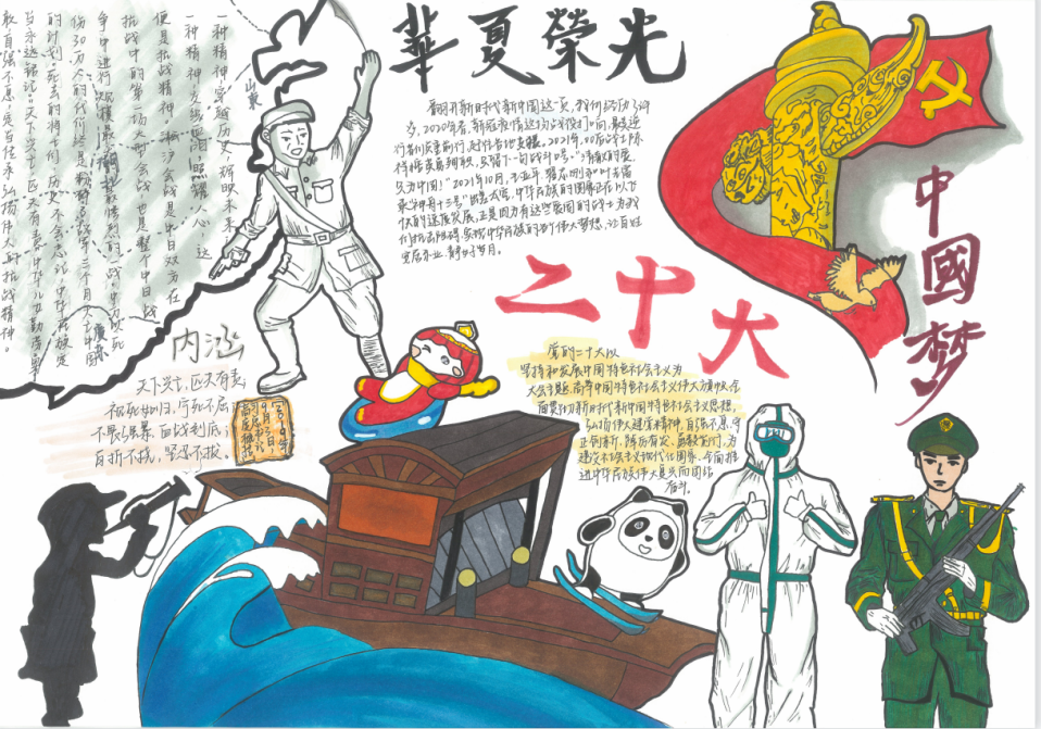 本次活动共有百名师生党员参加,共完成绘制百张画报。一张张手绘的反映党的二十大精神的画报,重现了国家在中国共产党的领导下,从风雨飘摇的觉醒年代到如今奋进的新征程;反映了人民在中国共产党领导下,从积贫积弱、民生凋敝的悲苦年代到富裕富足、人民幸福的美好新时代。