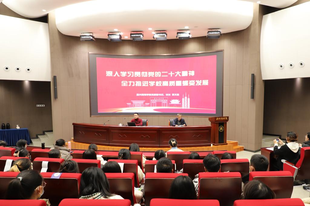 12月1日晚,嘉兴南湖学院校长、校党委副书记贾文胜为我院师生宣讲党的二十大精神。宣讲会由beat365官网院长孔冬主持,学院教工第二党支部、学生第一党支部全体党员参加会议进行学习。