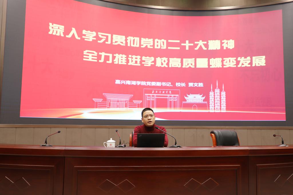 贾文胜指出,党的二十大报告强调,教育、科技、人才是全面建设社会主义现代化国家的基础性、战略性支撑。贾文胜希望,嘉兴南湖学院深入学习贯彻党的二十大精神和习近平总书记关于教育的重要论述,扎实推进“红色大学”、“城市大学”和“产业伙伴型大学”三大战略,努力建设成为特色鲜明、国内一流的应用型本科高校,为嘉兴教育事业发展作出新的更大贡献。广大教师牢记为党育人、为国育才使命,培养更多堪当民族复兴重任的时代新人。同学们始终牢记习近平总书记对青年大学生的嘱托和期望,坚定不移听党话、跟党走,努力成为有理想、敢担当、能吃苦、肯奋斗的新时代好青年,为实现第二个百年奋斗目标、实现中华民族伟大复兴的中国梦而不懈奋斗。