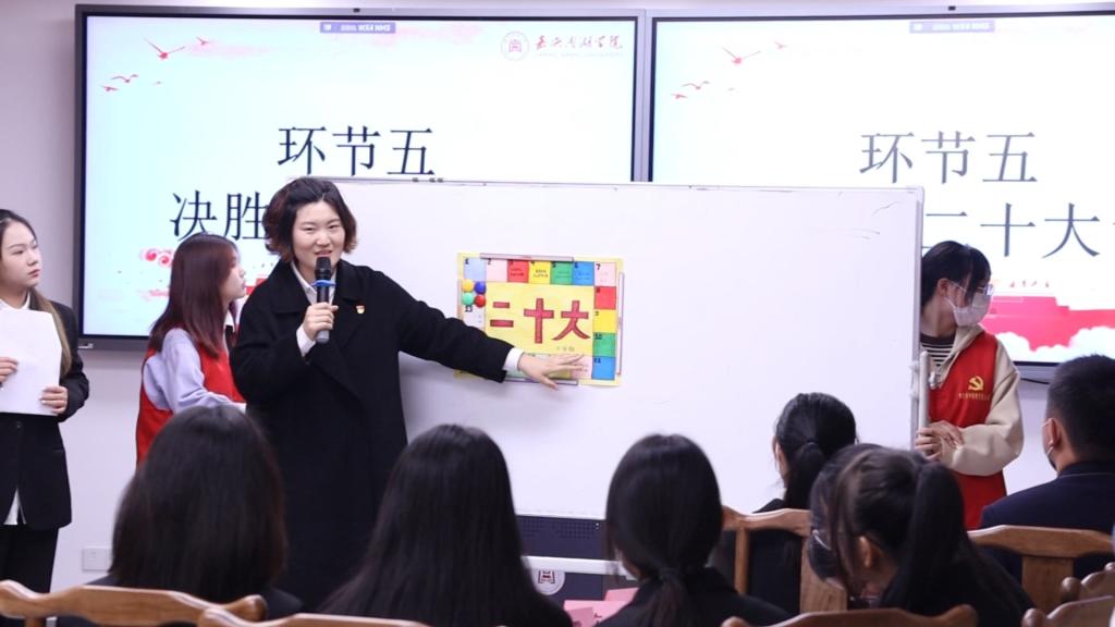 为引导我院广大师生原原本本学、系统深入学、联系实际学,让党的二十大精神在我院落地生根、开花结果。近日,由beat365官网学生党建工作室主办的党的二十大知识竞赛在校心理楼举行。beat365官网党委委员、综合办公室负责人夏江华、学生党建工作室负责人李艳燕、学生党支部书记周艳艳和付晓豪出席本次活动,各学生党支部党员及学生代表到场观摩。