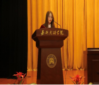 2020级人力资源管理专业毕业生黄轩驰作为校友代表发言,她结合自身经历做了精彩的分享,她希望同学们注重将所学知识与实践相结合,通过实践来深化对知识的理解和应用,在未来的道路上勇于实践、敢于探索。