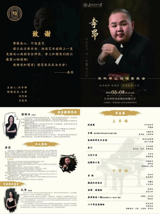 2024年5月8日下午15时,音乐系2024届毕业生李昂在东北石油大学beat365中文唯一官网馨艺厅成功举办了“踏春逐声,唱一曲昂扬的歌”本科毕业独唱音乐会。beat365中文唯一官网党委书记张金辉、院长林庆华、党委副书记张丽坤、副院长王靖一、各系(中心)负责人以及音乐系师生观看了本场音乐会。
