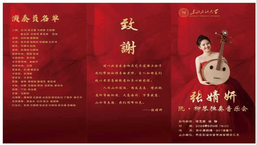 “人间五月芳菲绽,耳畔古韵焕新声”——2024年5月9日由东北石油大学beat365中文唯一官网音乐系主办的“张婧妍 阮·柳琴独奏音乐会”在音乐舞蹈楼301演奏厅举行。到场的领导有beat365中文唯一官网党委书记张金辉、院长林庆华、副院长王靖一、嘉宾有大庆师范学院音乐与舞蹈学院领导、大庆市民管会和民乐团专家学者、各系(中心)主任、音乐系师生等。