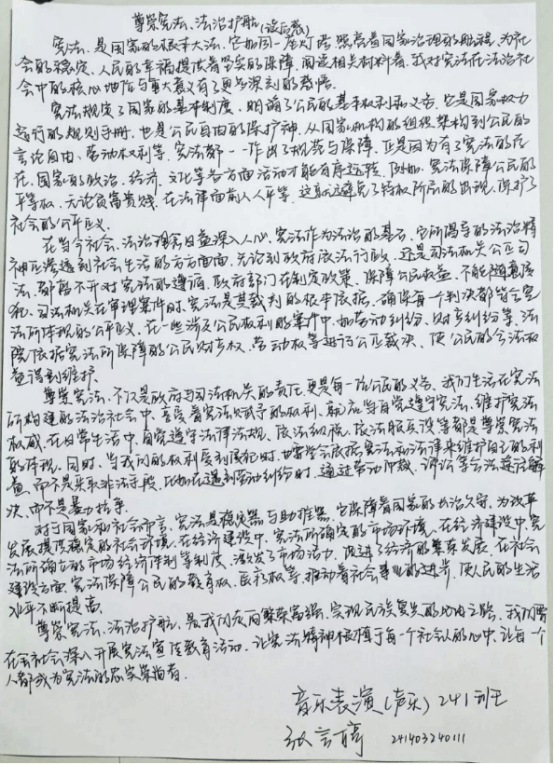 同学们还精心准备了宪法学习心得分享,以读后感的形式展现对宪法的深刻理解,字里行间透露出对法律的敬畏。此次活动强化了同学们的法治信仰,将尊崇宪法、维护宪法内化为自觉行动,为校园法治建设奠定了坚实基础,助力学子在法治护航下茁壮成长。