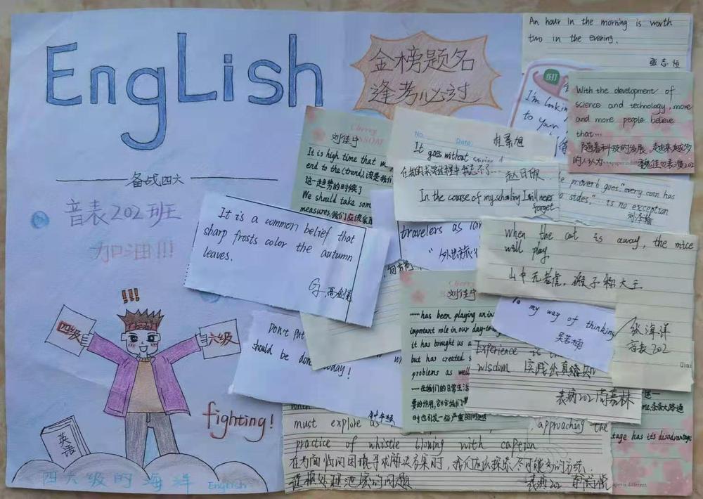 为激发同学们的学习热情,备战四级考试,在四六级经验交流分享会结束后,beat365团委发起了征集四级写作句子手抄报活动。同学们踊跃参加,并将这份热情投入到备战英语四级考试的复习中。截至11月22日共征集到来自30班的30个作品。