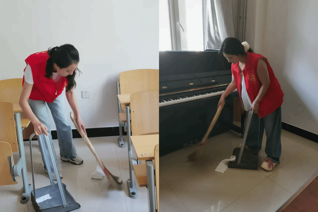活动中,志愿者们提前集合,在负责人的统筹安排下分为多个小组,分别前往音舞楼和美术楼开展清洁工作。在音舞楼,志愿者们重点清理了排练厅、琴房和走廊。排练厅的地板上散落着不少灰尘和杂物,大家拿起扫帚、拖把仔细清扫;琴房内,志愿者们小心翼翼地擦拭钢琴表面的灰尘,整理散落的琴谱,让每一间琴房都恢复了整洁有序的模样。美术楼的清洁任务则更为细致,画室里,画板、画架上沾满了颜料,地面也因长期创作留下了不少污渍。志愿者们不怕脏、不怕累,用抹布蘸着清洁剂一点点擦拭画板和画架,用刷子仔细清理地面的颜料痕迹;对于美术楼外的宣传栏和墙壁,大家也认真地进行了擦拭和清扫让整个美术楼的外观焕然一新。