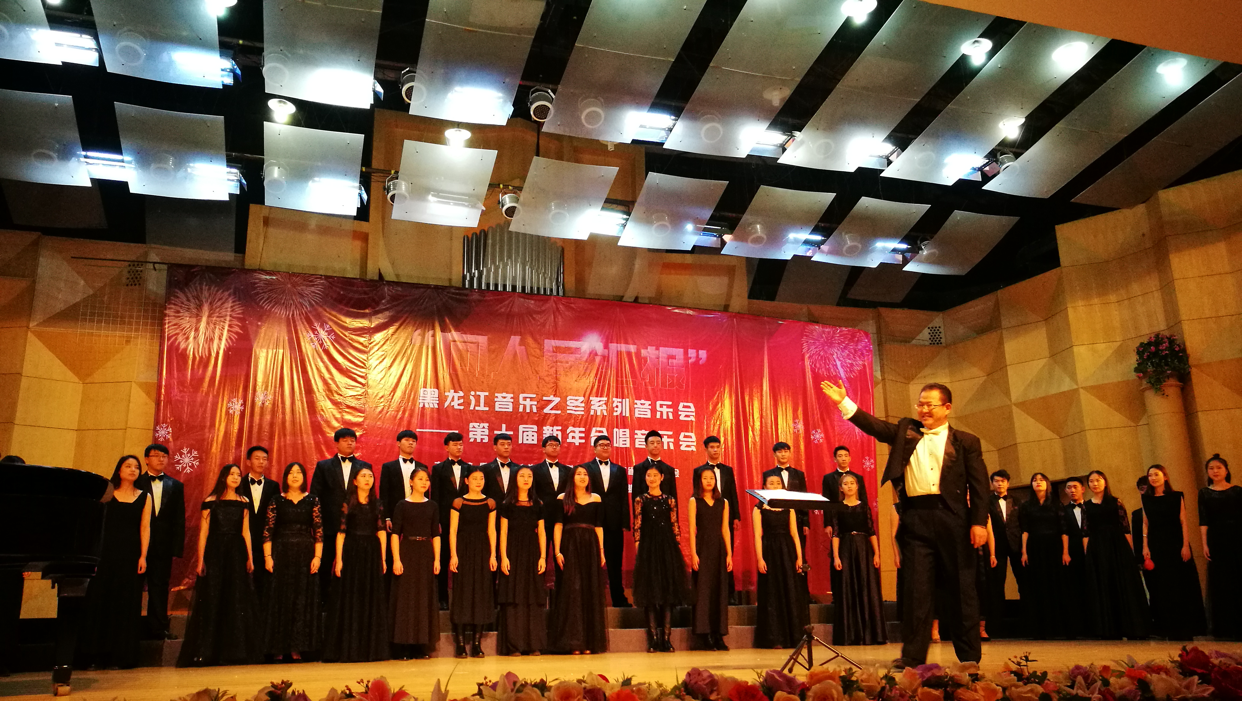 新年合唱音乐会是由黑龙江省文学艺术界联合会、黑龙江省音乐家协会主办,黑龙江省音乐家协会合唱联盟承办,作为黑龙江音乐之冬系列音乐会之一,本届新年合唱音乐会共邀请了来自哈尔滨、牡丹江、大庆、双鸭山、铁力等省内十一支优秀合唱团体参加了演出。音乐会上,我校合唱团演唱了西方经典拉丁文作品《Ave Maria》及极具非洲音乐特色的当代优秀作品《African Alleluia》,合唱团对两首作品的精彩演绎赢得了现场观众的热烈掌声,受到了音乐界专业人士的高度评价。