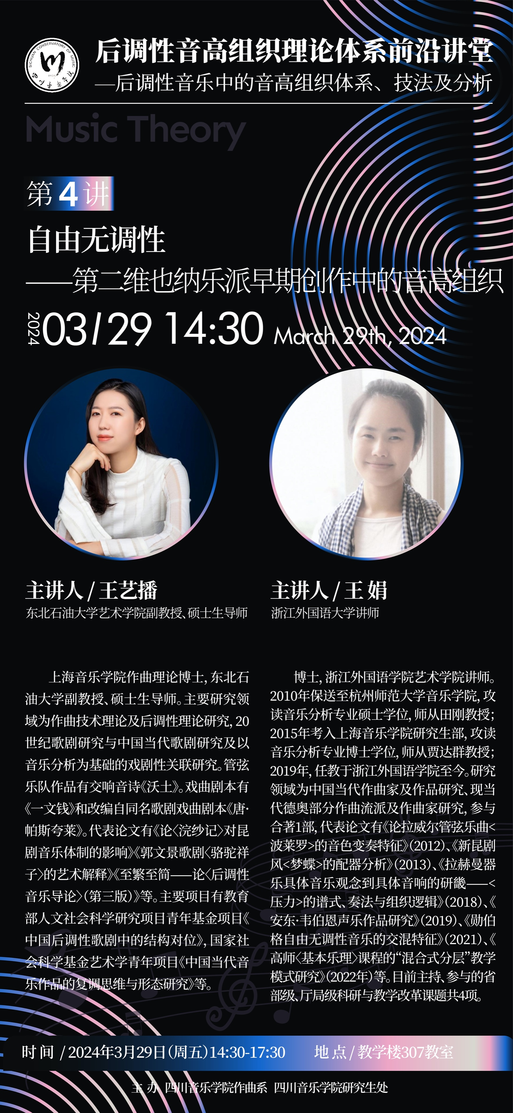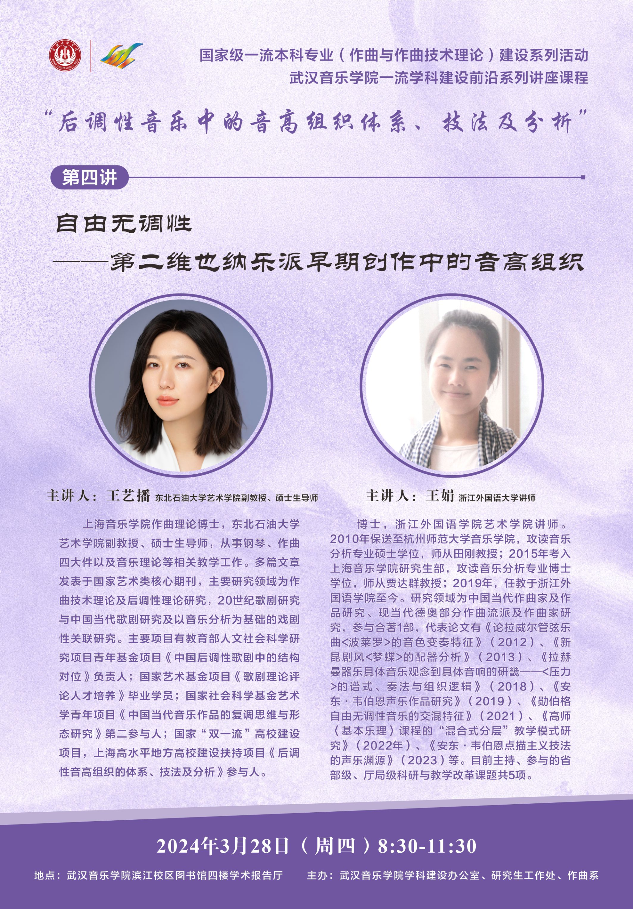 我校beat365中文唯一官网教师王艺播受邀于武汉音乐学院和四川音乐学院讲学。讲座主要内容“后调性音乐中的音高组织技术、技法及分析系列讲座”的第四讲《自由无调性——第二维也纳乐派早期创作中的音高组织技术》。