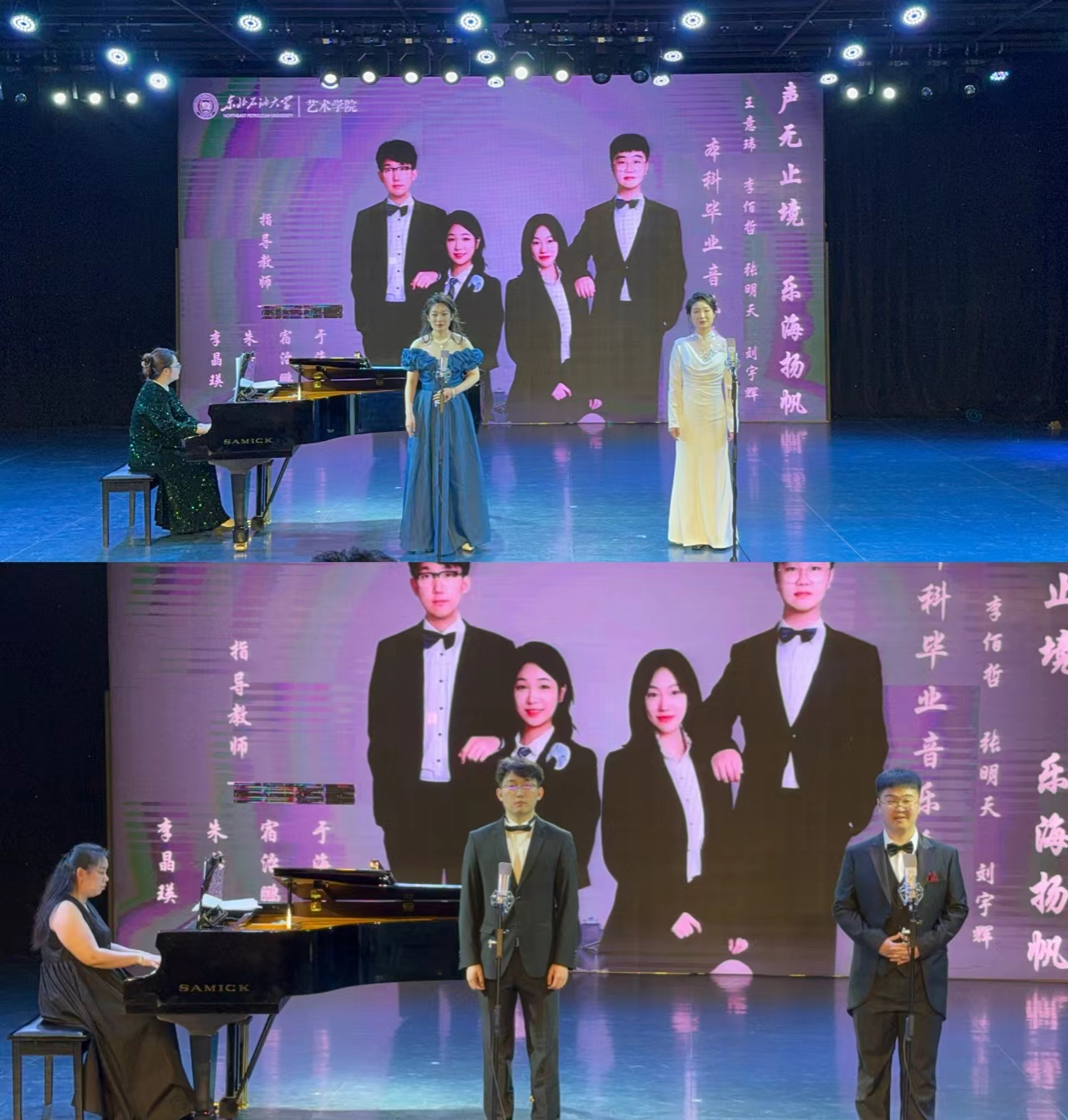 夏日的阳光轻抚着五月的花蕾,昔日的欢笑幻化成今日的离别。在这个充满温情与梦想的季节,东北石油大学beat365中文唯一官网2024届毕业独唱独奏系列音乐会轮番上演,为观众们带来了一场场震撼心灵的音乐之旅!本次系列音乐会由东北石油大学beat365中文唯一官网音乐系主办,主题为“青春无悔 扬帆远航”,共5场,2024年4月25日拉开帷幕,2024年5月13日圆满落幕。