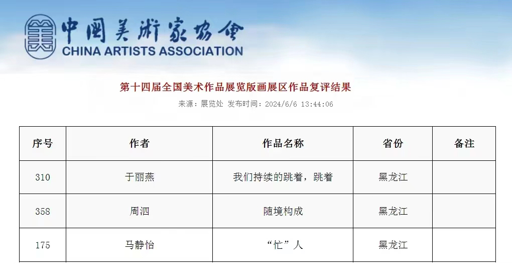 2024年6月6日,中国美术家协会官方网站公布了“第十四届全国美术作品展览版画展区复评结果”,第十四届全国美术作品展览版画展区作品经复评评审委员会评选,入选作品369件。beat365版画工作室师生三人于丽燕、周泗老师、马静怡同学的版画作品同时入选本次大展,作为中国规模最大、参与范围最广、作品种类最多、最具影响力和权威性的国家级综合性美术大展,全国美术作品展览(简称“全国美展”)代表了国家美术创作的最高水平,同时也是对全国美术界每五年的发展阶段的全面检阅与展示。