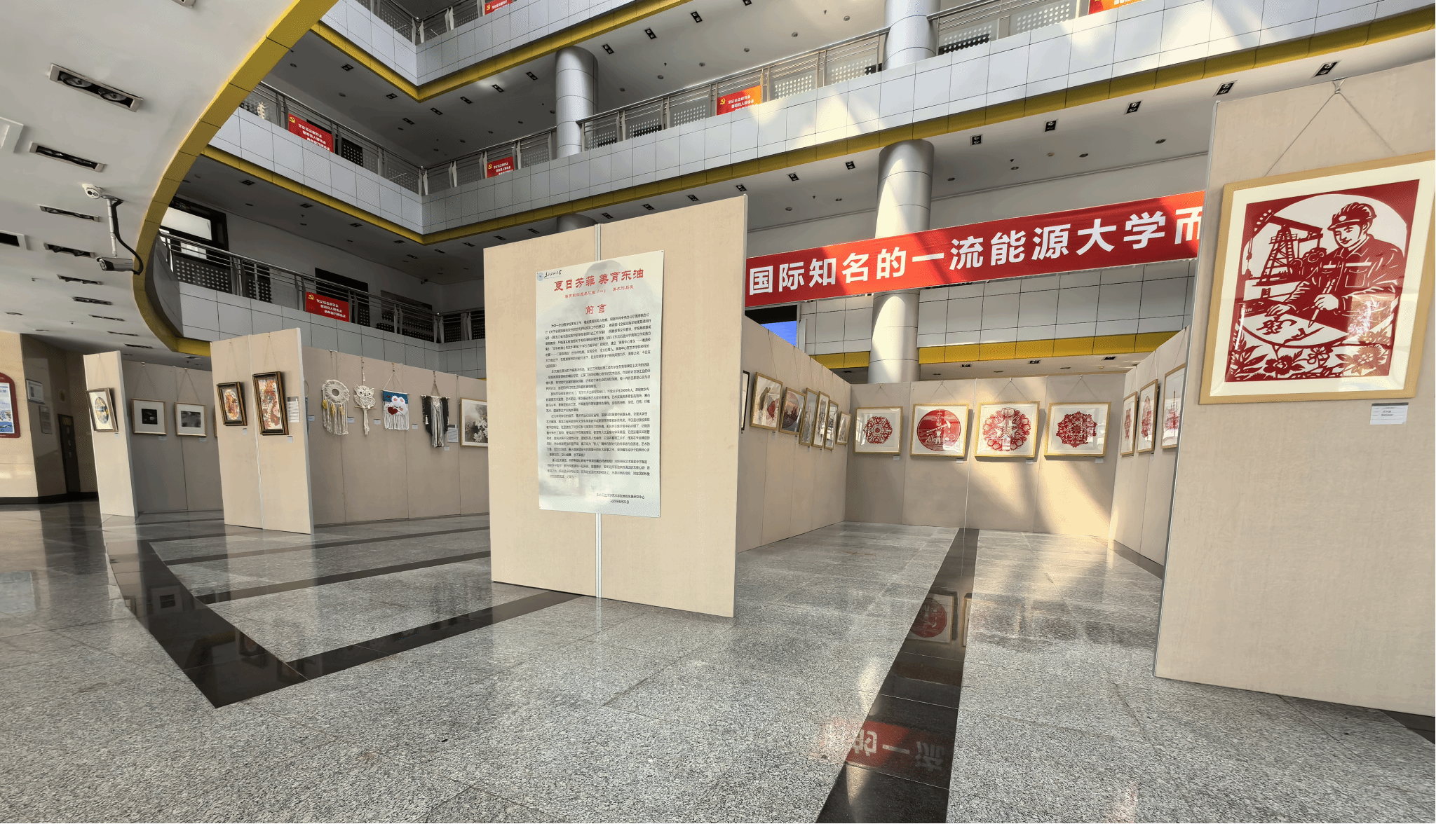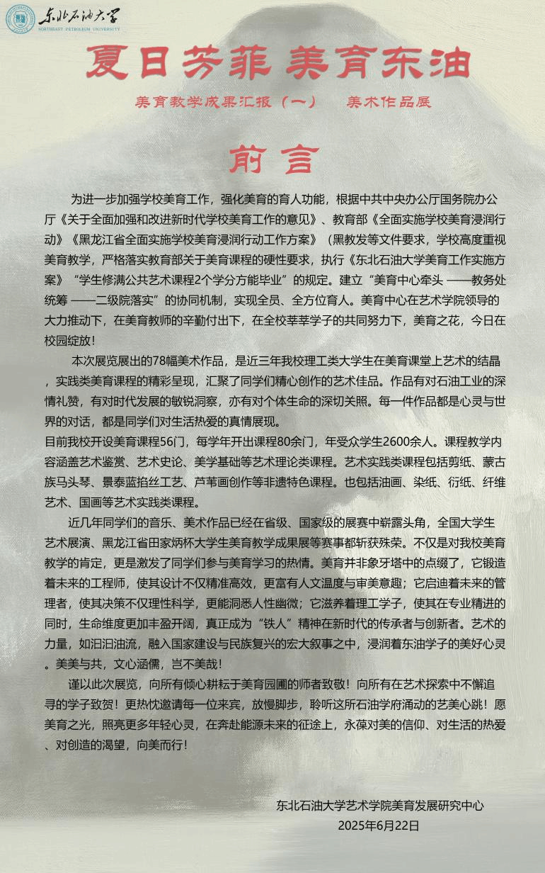 仲夏六月,艺术气息馥郁绽放,东北石油大学beat365中文唯一官网倾力打造的“夏日芳菲 美育东油”美育教学成果展,于2025年6月24日在校机关楼一楼盛大启幕。此次展出美术作品为beat365中文唯一官网美育发展研究中心针对全校理工科学生,开设的美育课程成果的集中展示。汇集学生精心创作的70件美术作品,涵盖油画、国画、剪纸、插画、衍纸、摄影、壁挂编制、珐琅彩制作等多个美术种类,全面呈现了学院近年来在美育教学方面取得的丰硕成果,为校园内外献上一场视觉与心灵的盛宴。