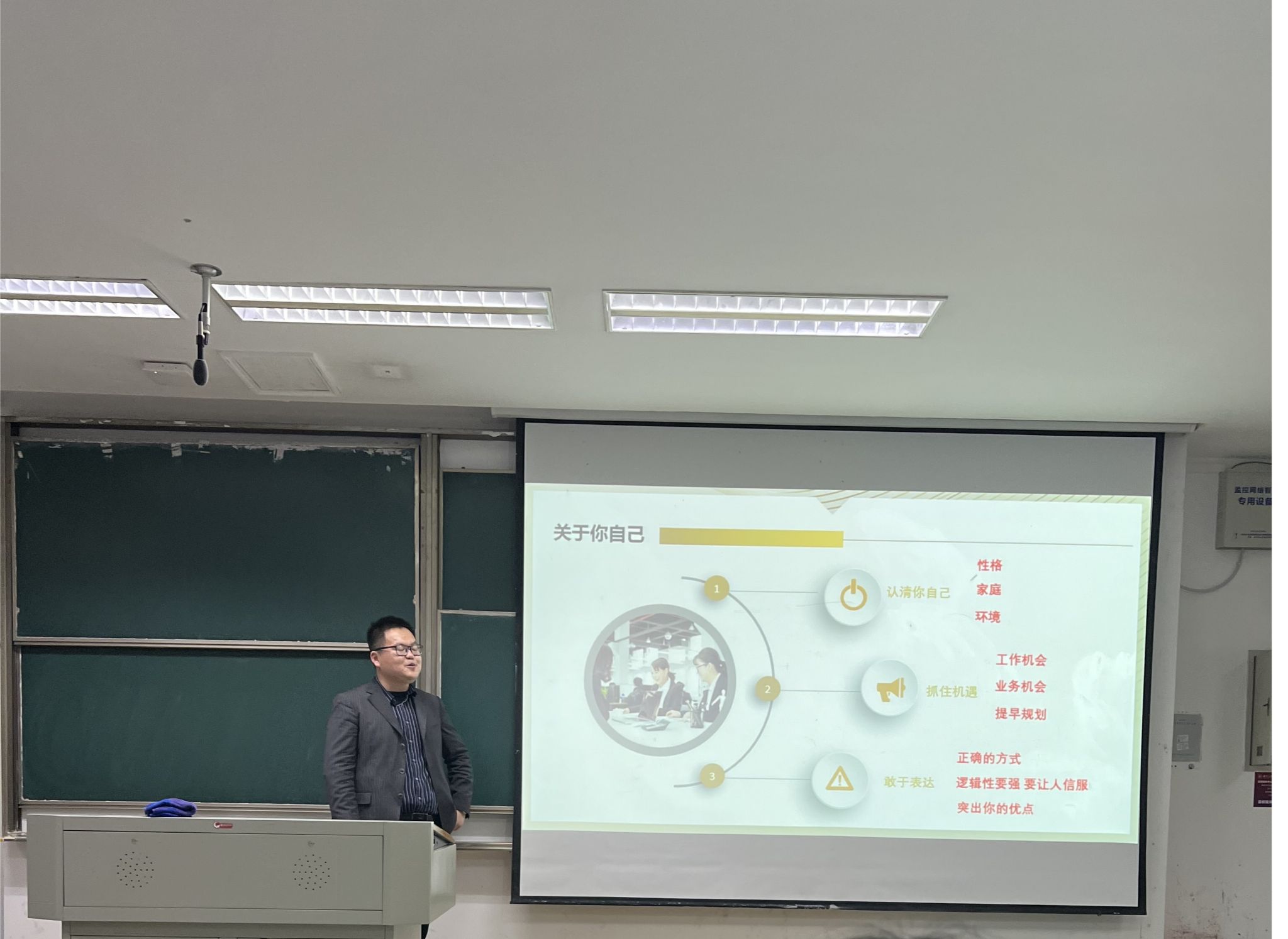 其次,殷老师对本专业的学生进行了相关的职业生涯规划指导,畅谈了自己对于目前本专业学生就业优势及劣势的看法。殷老师表示,在校的同学们应努力打开自己的格局与眼界,在择业的时候要学会结合自身的优劣势去进行尝试与选择,勇于抓住就业机遇。